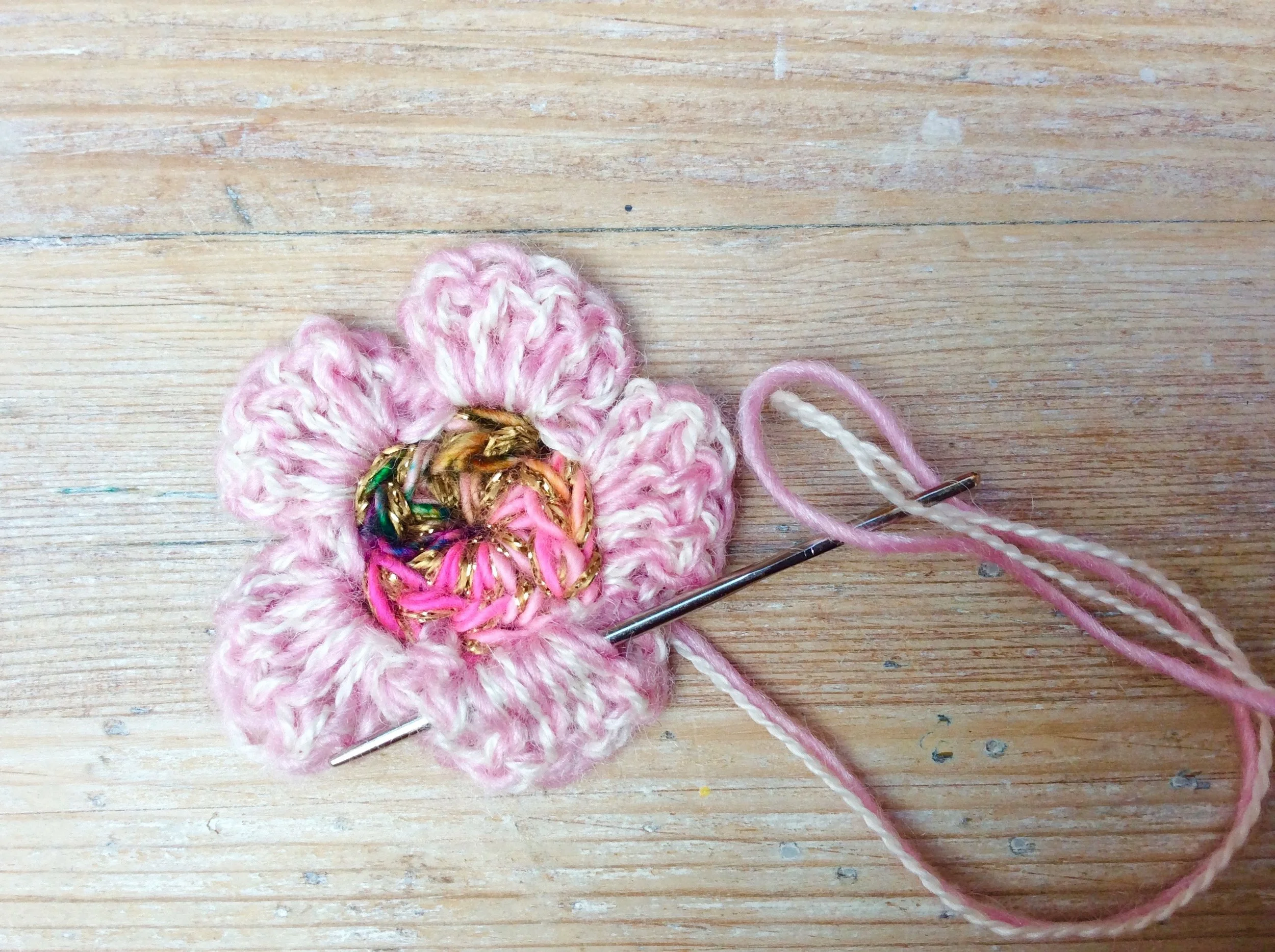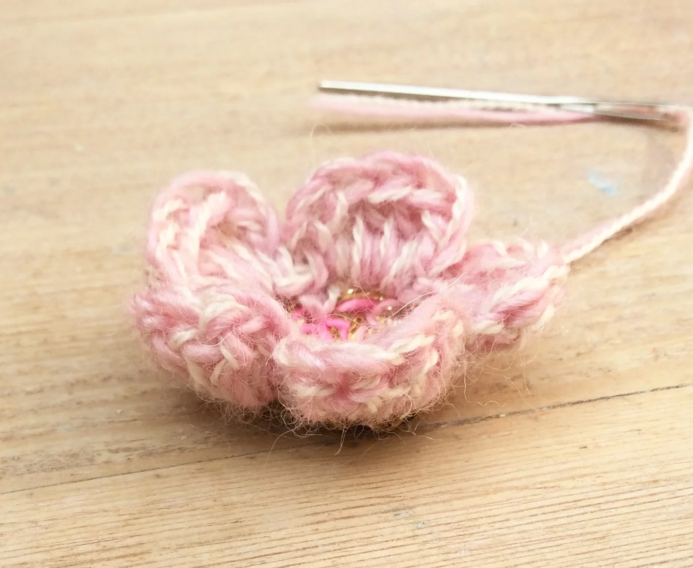 Cast off. Cut yarn leaving a long tail about 15 cm long. Turn the flower over and with a yarn needle thread the tail under the base of the petal stitches all the way around.